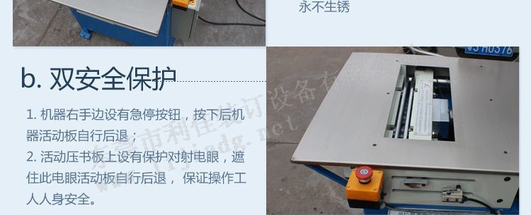 3.双重安全保护;机器右手边设有大头自锁按钮,按下后机器活动板自行后退;活动板上设有保护对射电眼,遮住此电眼活动板自行后退从而保证人身安全;