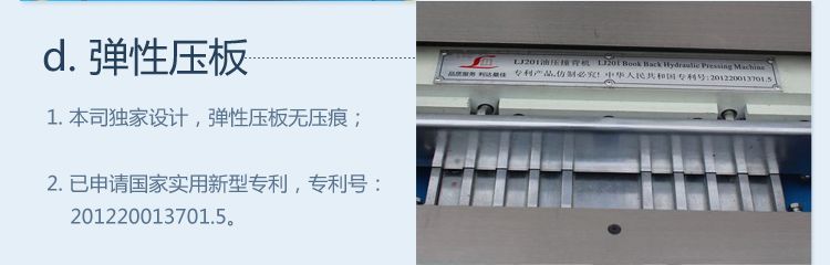 4.本机独家设计弹性压板;一般厂家生产的压背机压板是固定的,压书时书芯表面会出现压痕,采取措施即在压板上用双面胶贴厚纸板来消除书籍上压痕。但纸板经常会脱落滑动,很不方便。本公司根据这种情况设计生产出弹性压板,已荣获专利,专利号:201220013701.5。在正常压书时,压板在压紧书籍时会自动后摆,从而消除书籍夺压紧时产生的压痕;