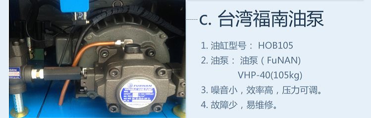 首先需知道此机的相关配置:油泵,油缸和马达,本机油泵采用台湾生产的福南(FUNAN)油泵VHP-40(140kg),公称压力:140kgf/cm2,油缸采用重型油缸:HOB125,液压缸杆径为60,参照油缸理论出力表,其在140kgf/cm2作用下压力为:17180kgf=17.18吨,按正常最大压力100kg作用下压力为:12.27吨,所以本机标示压力参数为:12吨,再根据整套系统情况,保证机器动作快速稳定,压力可靠选定马达功率为:3.7kw。