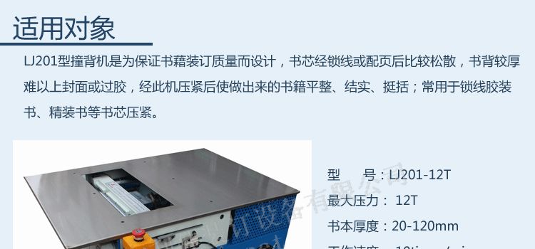 5.本机为保证书藉装订质量而设计,书芯经锁线或配页后比较松散,书背较厚难以上封面或过胶,经此机压紧后使做出来的书籍平整、结实、挺括;常用于锁线胶装书、精装书等书芯压紧。
